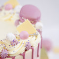De taart is afgewerkt met marmerlook botercrème in witte en lila tinten. De paarse drip geeft de taart extra flair, terwijl toefjes crème, paarse macarons en sprinkles zorgen voor een feestelijke topping. Deze paarse driptaart is dus zowel sierlijk als speels.